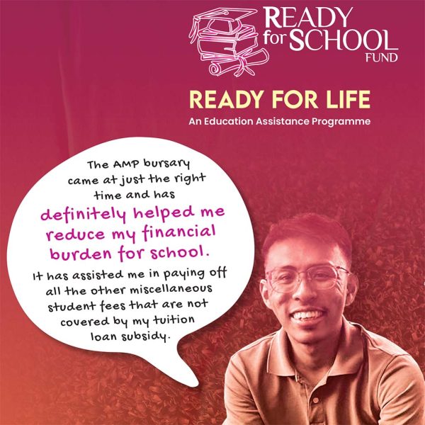 The Ready for School (RFS) Fund, established in 2002, supports underpriviledged students through the AMP Education Bursary, AMP x Salleh Marican Foundation STEM Study Award, RFS Youth Enrichment Series and other socio-educational resources. Every dollar raised will make a difference to our students' lives by providing them with opportunities to realise their aspirations through education. AMP hopes to raise enough funds to provide an equal opportunity for deserving students in their pursuit of higher education in light of increasing costs.